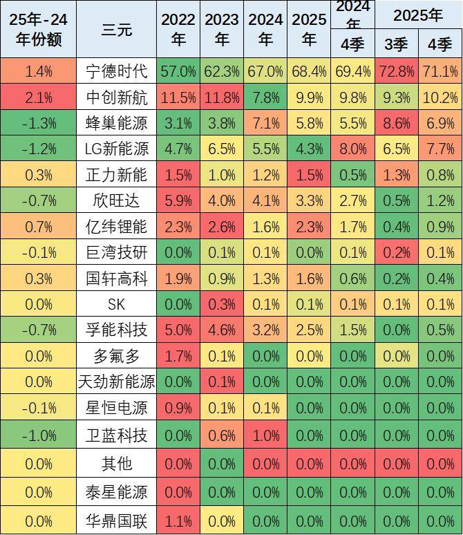 磷酸鐵鋰電池的產品差異優勢明顯。比亞迪相對優秀,但今年年初處于調整期。寧德時代的磷酸鐵鋰電池的占比份額2024年已經反超比亞迪。2025年比亞迪走勢較好,份額較2024年同期增長3個百分點。中創新航表現較強。欣旺達、瑞浦蘭鈞、蜂巢能源、極電新能源的提升明顯。