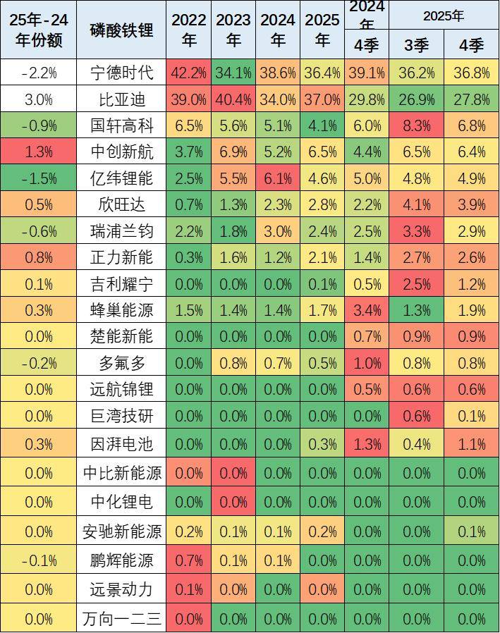 電池企業的競爭格局形成寧德時代和比亞迪兩者相對較強的特征。寧德時代的2025年4季度占比下降到43.2%,比亞迪的占比從2020年的15%上升到2023年的26.9%,隨后下降到今年4季度的22.6%;其它電池企業的占比也出現了明顯分化的態勢。電池企業形成了頭部企業聚集效應放緩的特征,從2022年的頭兩家企業72%的比例,寧德和比亞迪到2025年仍保持62%的比例,其它企業的空間有超30%左右的空間。今年中創新航、吉利耀寧、楚能新能等表現較強。