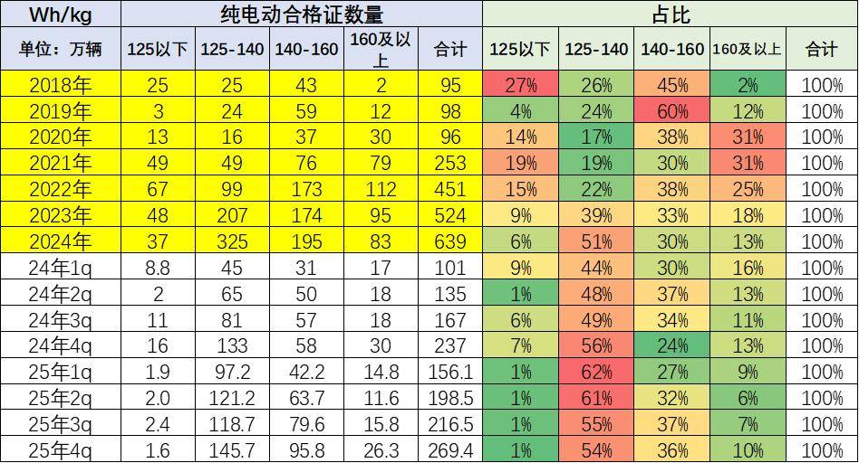 純電動車目前主力電池能量密度區間在125到160之間。尤其2025年4季度表現比較突出的是140到160的電池占比達到36%,同比上升12個百分點。