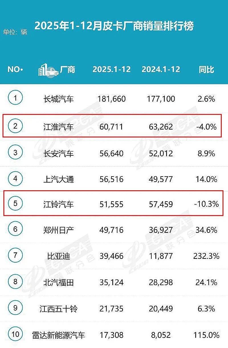 值得一提的是,在一眾皮卡車企增長的大背景下,也有兩家車企出現了下滑。其中,江淮汽車2025年銷量超6萬輛,同比下滑4%。