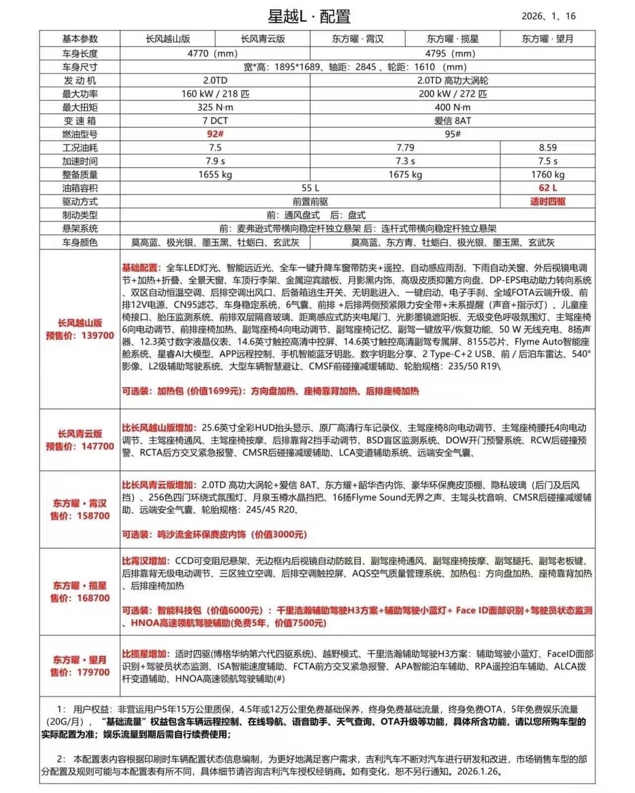 至于動力方面,26款長風系列將繼續搭載2.0T發動機,最大功率160kW(218馬力),峰值扭矩325N·m,傳動系統匹配7速濕式雙離合變速箱,不過根據配置信息顯示,新車加92號汽油即可。底盤也依舊為帶橫向穩定桿的前麥弗遜式/后連桿式獨立懸架。當然,關于新車的信息還有待官方進一步公布,那么,對于星越L全新長風系列您有什么看法,認為13.97萬元起的預售價格合適嗎?