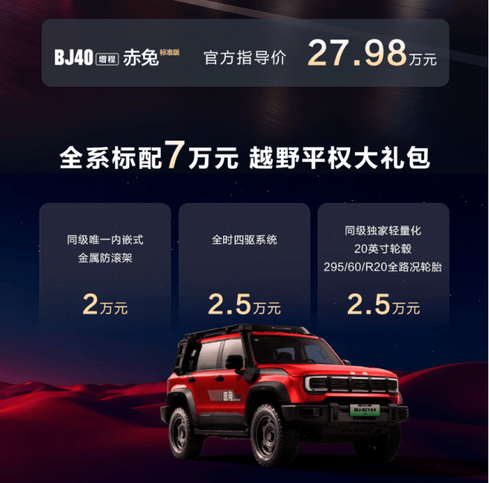 在當天發布的多款車型中,BJ40增程赤兔標準版無疑是最具“態度表達”的一款。北京越野董事長王昊在現場直言,BJ40一直擁有足夠扎實的機械底子,而用戶真正困擾的,是改裝與合規之間的長期矛盾。赤兔標準版的出現,正是試圖用“原廠改裝”的方式,解決越野玩家“想改、敢用、能上路”的現實需求。27.98萬元的官方指導價之下,車輛將防滾架、全時四驅系統、20英寸輕量化輪轂及全路況輪胎等高價值配置一次性整合進原廠方案,避免了后期改裝的反復投入與年檢隱憂,也讓個性化不再游走于規則邊緣。