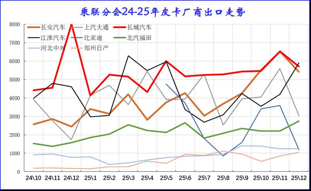 2025年皮卡市場(chǎng)主力廠商表現(xiàn)仍較好,長(zhǎng)城汽車皮卡保持較強(qiáng)的絕對(duì)優(yōu)勢(shì)地位,長(zhǎng)安汽車、上汽大通、江淮汽車等12月走勢(shì)較強(qiáng)。
