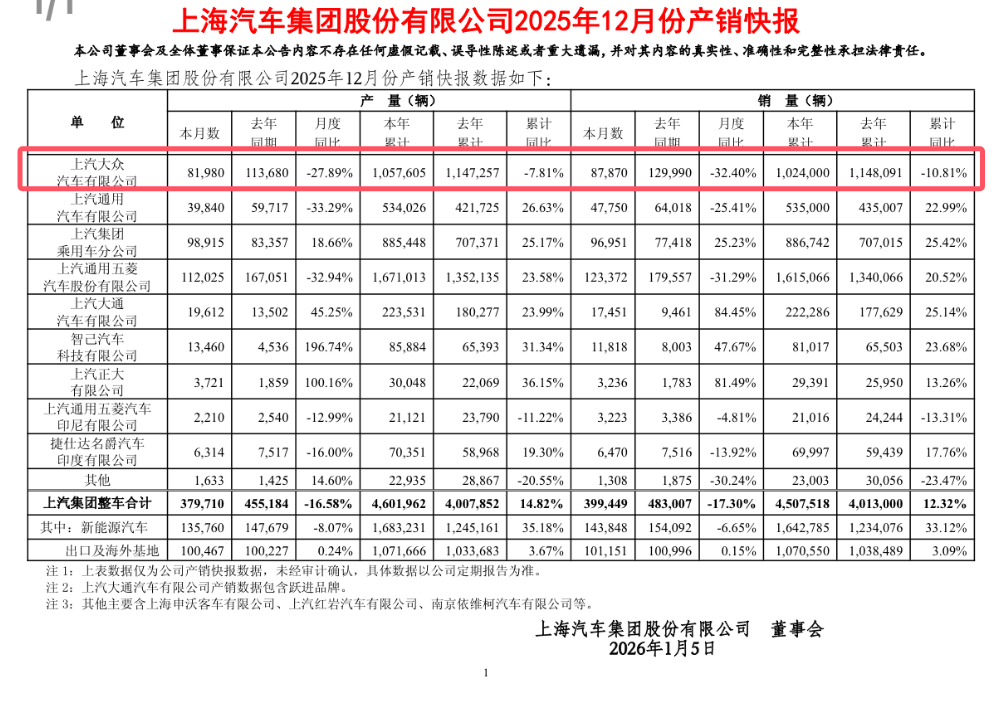 上汽集團最新產銷快報數據顯示,上汽大眾在2026年開年第一個月銷售新車68,402輛,同比下滑8.98%。顯然,2026年1月份,上汽大眾的單月銷量并沒有取得“開門紅”的銷量成績。尤為值得注意的是,2026年1月份,上汽集團整體銷量呈現出不錯的上漲態勢。