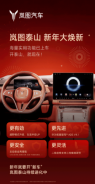 從昨日開始,嵐圖汽車正式向嵐圖泰山車主推送OTA升級,此次升級涵蓋包括華為乾崑智駕ADS 4.1在內的智能座艙、輔助駕駛和越野性能三大維度,將嵐圖泰山的綜合實力進一步提升。