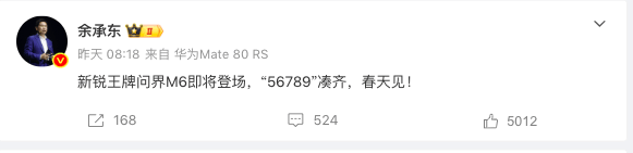 華為常務董事、產品投資評審委員會主任、終端BG董事長余承東在2月3日在個人微博平臺發布:新銳王牌問界M6即將登場,“56789”湊齊,春天見!