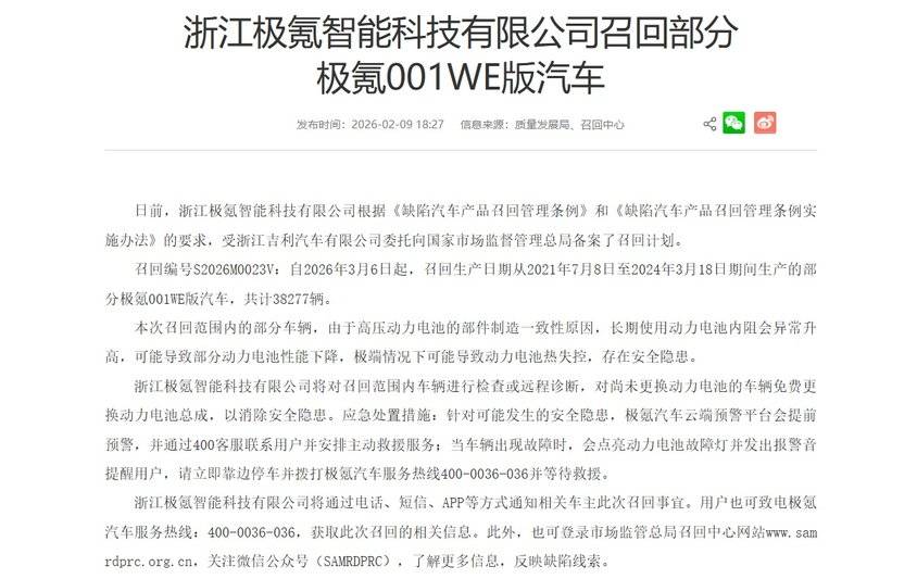 近日,極氪宣布,基于其智能云端監測系統的長期數據反饋,對生產日期在2021年7月8日至2024年3月18日期間的部分極氪001 WE 86版車輛實施主動召回,以徹底消除因動力電池內部部件制造一致性問題帶來的性能下降或潛在風險,持續守護用戶安全。此次召回涉及車輛共計38,277臺,目前極氪在售全系車型均不在此次召回范圍之內。