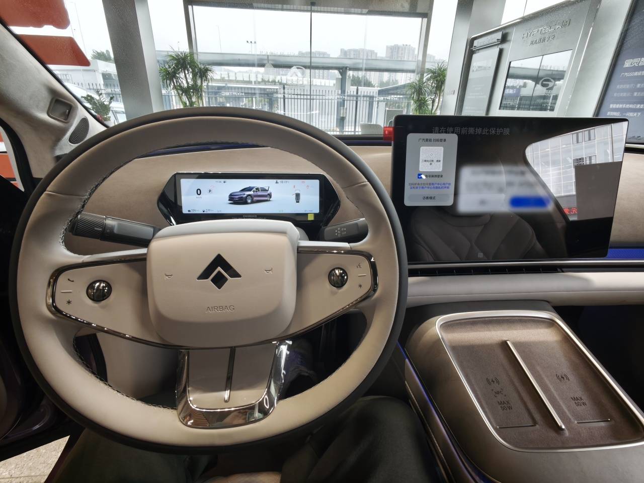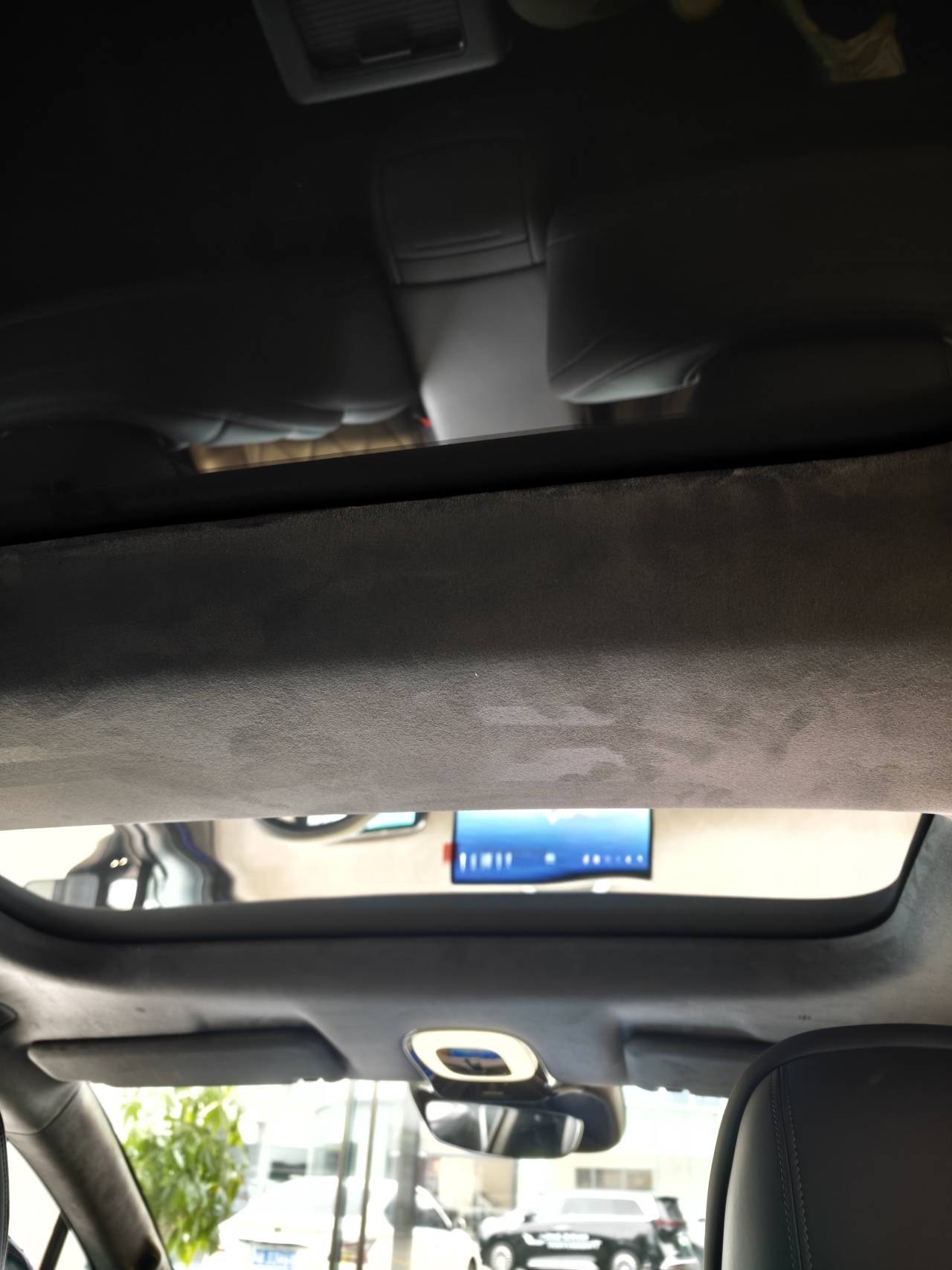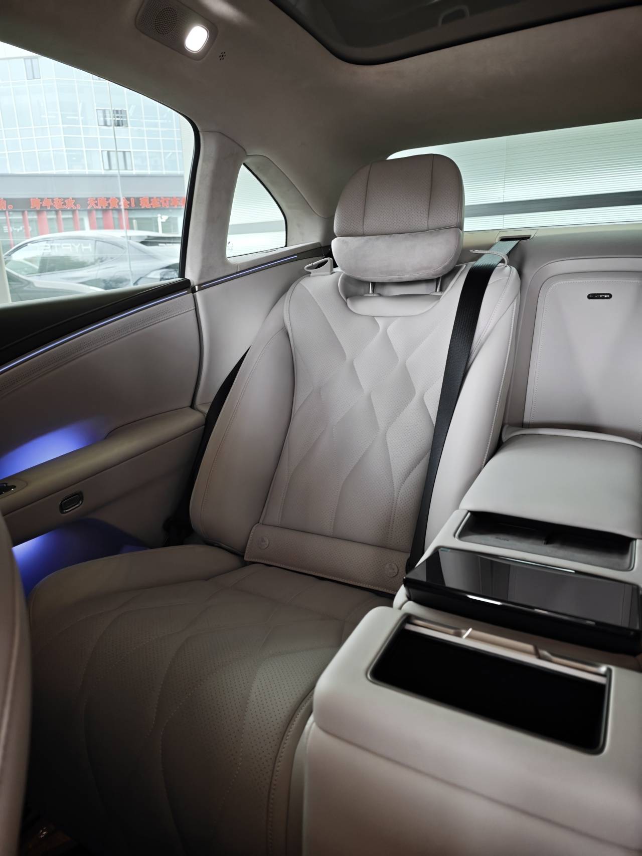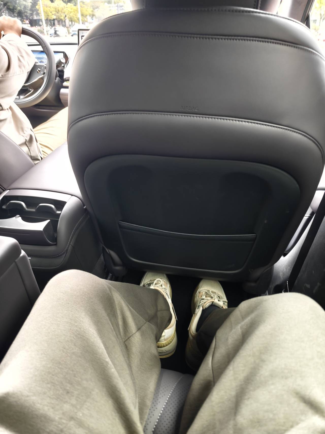 如果躺椅不打開(kāi),以我170cm的身高大約是3拳的腿部空間,頭頂距離這個(gè)被翻毛皮包裹的車(chē)頂橫梁大約有4指;躺椅打開(kāi)后,腿部空間會(huì)縮小一些,但整個(gè)身體會(huì)以一種很舒服的姿態(tài)舒展開(kāi)。前排座椅背后應(yīng)該也布置了氣囊,我在副駕背面發(fā)現(xiàn)了AIRBAG的字樣。