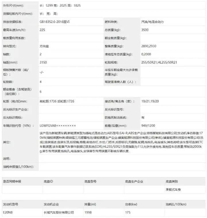 動力部分,魏牌V9X將搭載一套2.0T插混系統并運用800V高壓架構+Hi4電混四驅系統。其2.0T混動專用發動機最大功率輸出175kW,滿電狀態0-100kph加速成績4.4秒,虧電狀態下0-100kph加速成績4.7秒,極速210kph,動力性能強勁。得益于800V高壓架構以及所搭載的53.6kWh和77.7kWh兩種容量的6C電池,魏牌V9X的CLTC工況純電續航分別有240公里和363公里兩種版本,充電5分鐘即可補充200公里純電續航。