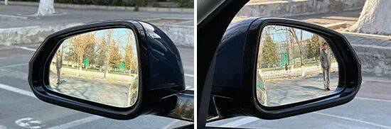 外后視鏡視野范圍測試時,首先讓測試人員分別站在左右后視鏡垂直10m處,隨即開始向左右兩側移動,直至出現在兩側后視鏡最外側邊緣為止,測出其橫向距離。隨后通過公式計算,便可以得出后視鏡視野范圍的夾角角度。角度越大則后視鏡視野盲區范圍越小,反之則后視鏡視野盲區越大。