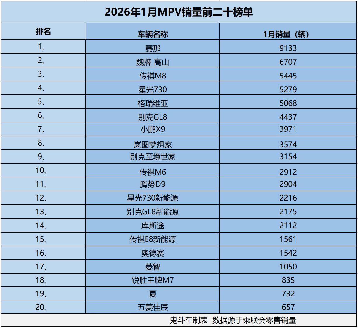 不過,這一細分市場銷量表現很一般,日前,乘聯會發布1月零售銷量數據,鬼哥整理出1月MPV市場銷量排名前二十榜單,從榜單上看到,沒有一款MPV車型銷量過萬,典型的流量高銷量低。接下來,看看具體的車型排名與銷量表現。