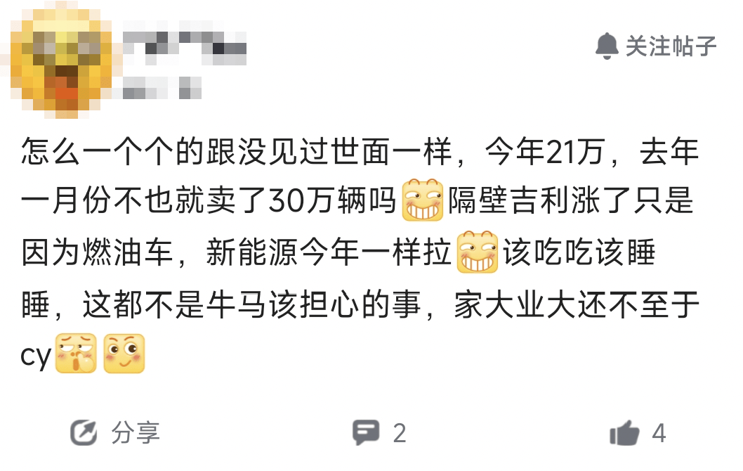 所以面對很多人對比亞迪前景和未來的擔憂,我們正好在職場APP上看到了認證為比亞迪的員工,發表的幾句對1月份銷量的表述,我覺得這就是一種自信。他表示,怎么一個個就跟沒有見過世面一樣,今年21萬(輛),去年1月份不也就賣了30萬輛,并且表示該吃吃該睡睡,這不是牛馬該擔心的事,家大業大還不至于……