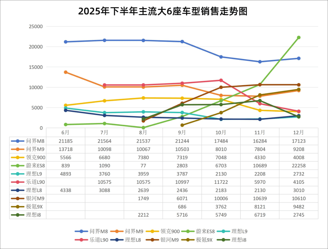 其它賽道早已擁擠不堪,但大六座SUV憑借家庭用戶的剛性需求、高端化的價值屬性,成為少數仍保持雙位數增長的新藍海。2025年它累計銷量突破108萬輛,同比增長18.3%,曾由理想獨霸天下的市場,如今已擠滿問界、極氪9X等和騰勢N8L等實力派玩家。