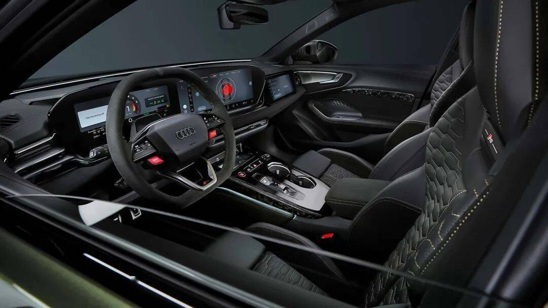 進入車內,新一代RS5采用全新的虛擬座艙設計,環抱式座艙采用大面積Alcantara面料包裹,中控臺門板四周也配上碳纖維裝飾面板、鍍鉻元素點綴,提升整車質感。平底式RS多功能方向盤、換擋撥片以及帶有六邊形紋路的賽車座椅(材質選用Nappa和Valcona真皮混搭),帶來了濃郁的戰斗氛圍。中控臺配備12.3英寸的全液晶儀表、10.1英寸+8.6英寸的觸摸中控大屏,搭載的車機系統,支持CarPlay、CarLife,通過投射第三方導航及娛樂App大幅提升實用性及便捷度。座椅則是賽車風格的一體式座椅,帶有專屬的RS標識,座椅獨特的包裹性與縫線讓人血脈僨張,前排座椅采用金色的縫線,后排則是紅色縫線。