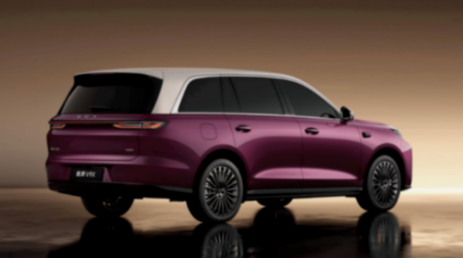 車身尺寸長寬高分別為5299/2025/1825mm,軸距3150mm,相比同級9X、問界M9、理想L9等更大一些。龐大的身軀配合立體的線條勾勒,給人感覺很有氣場,且不乏肌肉力量感,而金/紫雙拼色車身,配合車窗四周鍍鉻飾條點綴、21英寸密幅式輪轂等,也進一步提升了豪華氣息。多層次感的尾部造型與整車風格相得益彰,貫穿式尾燈也與前臉相呼應,并加入有“智駕小藍燈”。