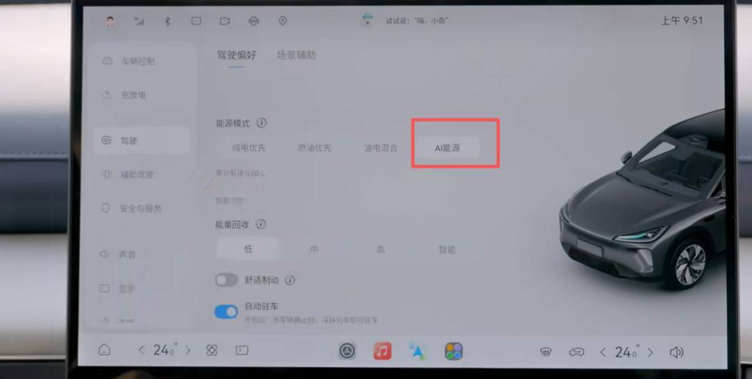 有意思的是這臺(tái)車(chē)的AI能源模式,開(kāi)啟之后,系統(tǒng)會(huì)根據(jù)導(dǎo)航和本地存儲(chǔ)的路線數(shù)據(jù),智能切換油電模式,理論上能實(shí)現(xiàn)最省的能耗表現(xiàn)。