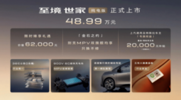 2026年3月17日,別克品牌宣布:旗下首款純電MPV——至境世家純電版上市,推出純電奢享版一款車(chē)型,官方指導(dǎo)價(jià)48.99萬(wàn)元。至境世家純電版延續(xù)“別墅級(jí)新能源旗艦MPV“定位,完整繼承插混版車(chē)型的硬核實(shí)力,更以900V 6C超快充電池、“啞光灰”雙拼色高定涂裝、“金石之約”用戶(hù)權(quán)益、特斯拉車(chē)主專(zhuān)屬增換購(gòu)禮遇等多項(xiàng)行業(yè)首發(fā)科技與權(quán)益,實(shí)現(xiàn)純電出行體驗(yàn)的全面躍升。