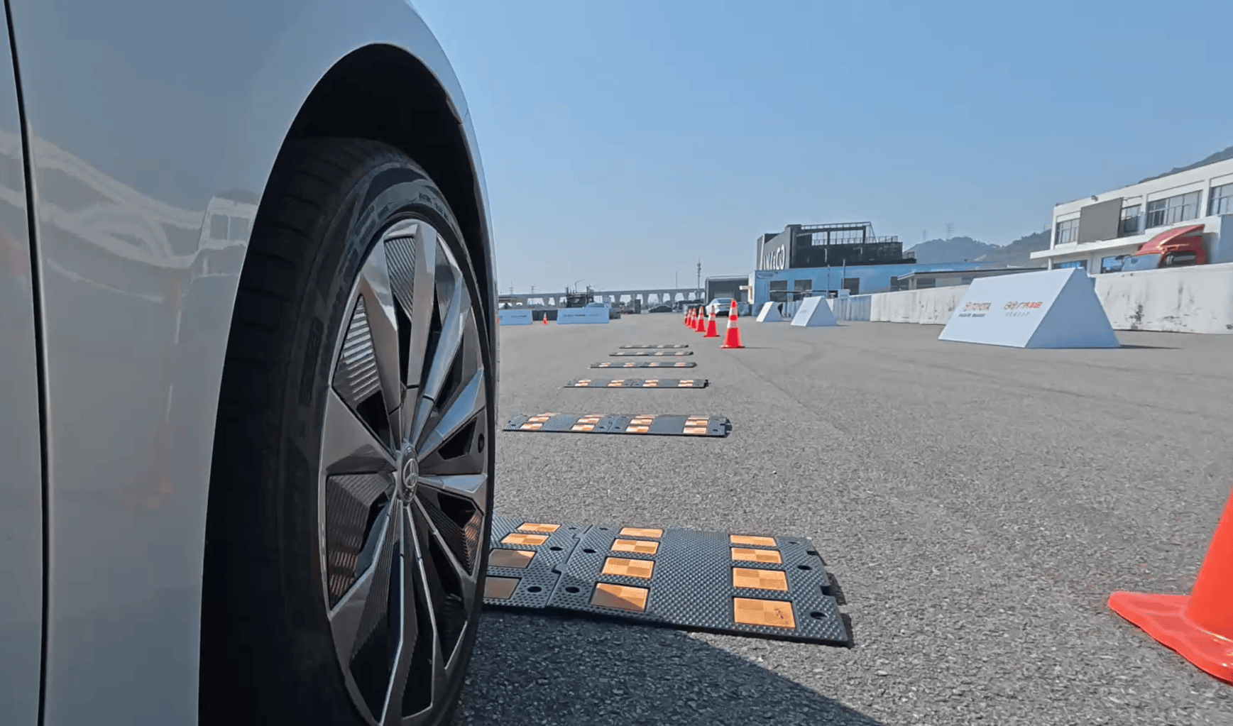 為了能更直觀體驗連續減速帶科目,我特意從酒店中帶了個酒杯。科目體驗開始時,我在酒杯加了約70%的水,讓坐在副駕的教練幫我舉著。將駕駛模式調節到舒適,懸掛調節到最高,然后開始通過連續減速帶。而連續減速帶擺放的位置也沒有“投機取巧”——先是一小段路全是2.5米寬的減速帶,讓兩側車輪同時壓過,接著是左方一側有減速帶,然后是右側單獨有減速帶。