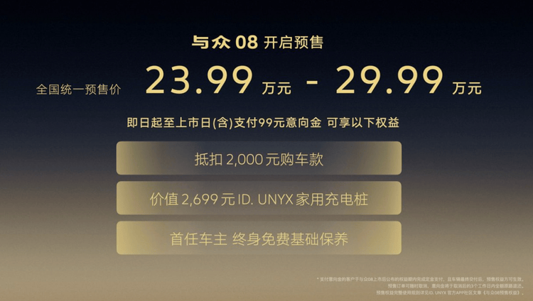 3月26日,金標大眾家族全新成員——首款全時互聯全尺寸純電SUV與眾08首秀,并同步開啟預售,預售價格區間為23.99萬元-29.99萬元。按照規劃,2026年,金標大眾將迎來強大的產品攻勢,并全面開啟“交付模式”,計劃在最重要的細分市場推出4款新車。