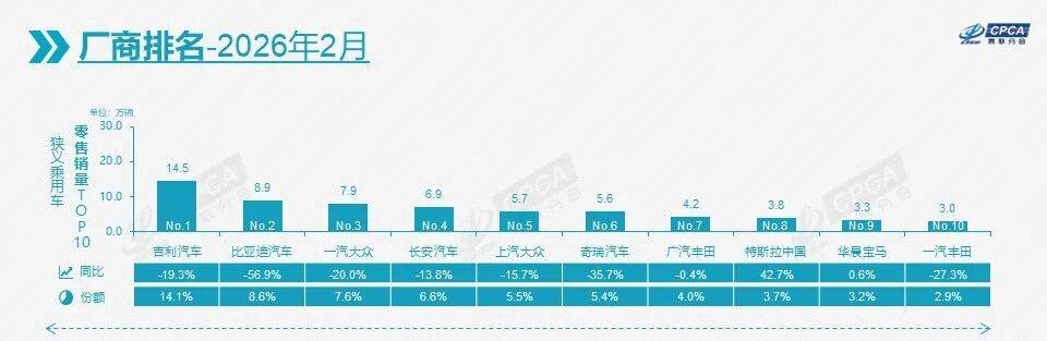 從車企維度來看,2月國內乘用車銷量榜單同樣呈現出“冰火交織”的格局。在整體市場大幅下滑的背景下,頭部車企的座次與份額發生了明顯變化。