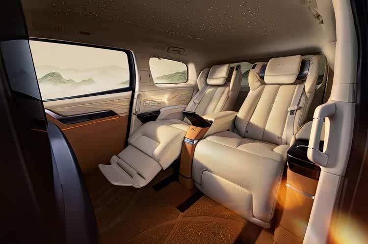 座椅方面采用 12 層復合結構,表層使用北美小公牛皮源 Fine Nappa 半苯胺真皮,配備 22 點分區指壓按摩與石墨烯遠紅外理療功能。私密空間上,車輛搭載府邸級私享座艙隔斷體系,配備 32 吋可升降智能屏,可實現全封閉私密與通透交互兩種模式切換,同時支持前后艙對講功能。