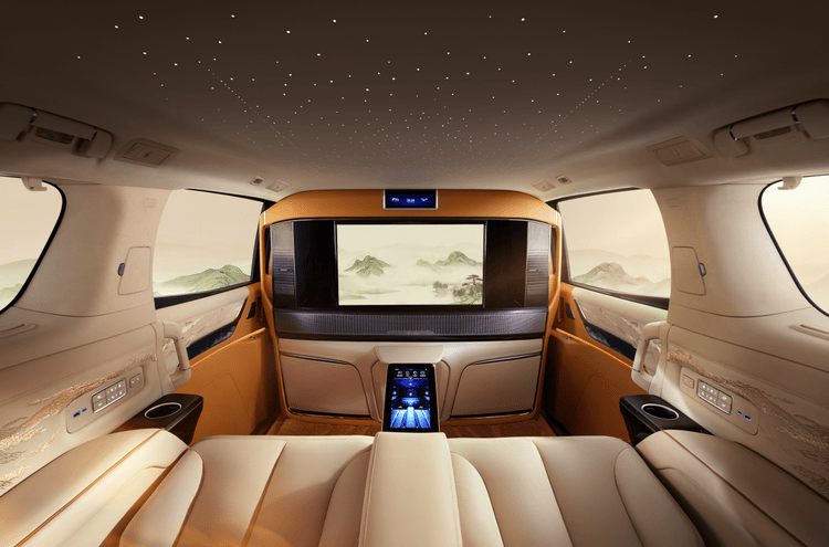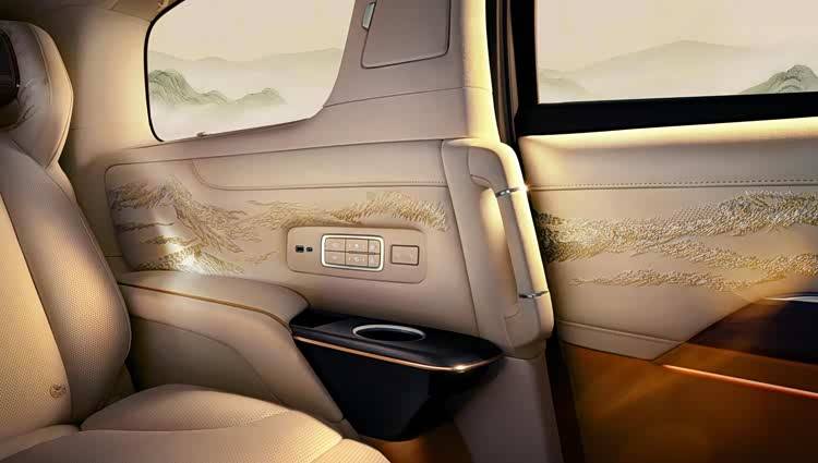 座艙內飾細節融入東方山水元素,琥珀瓷白內飾中搭載 136092 針純手工 “江山如畫” 主題刺繡,配備同級唯一 15mm 手工割絨進口羊毛腳墊,星河繡帷星空頂棚提供 8 大星空模式與語音觸發流星功能,強化座艙沉浸式體驗。