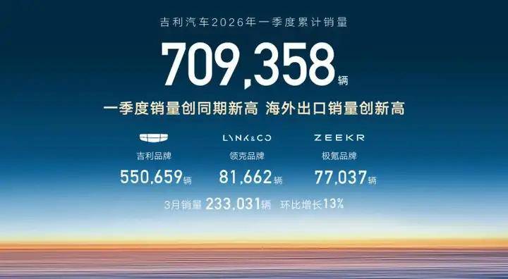 在行業轉型階段,吉利通過“一個吉利”體系協同,實現銷量與品牌價值同步提升。2026年一季度,吉利汽車總銷量709358輛,重回中國品牌銷量第一。其中吉利品牌550659輛,領克81662輛,極氪77037輛,3月單月銷量233031輛,環比增長13%。